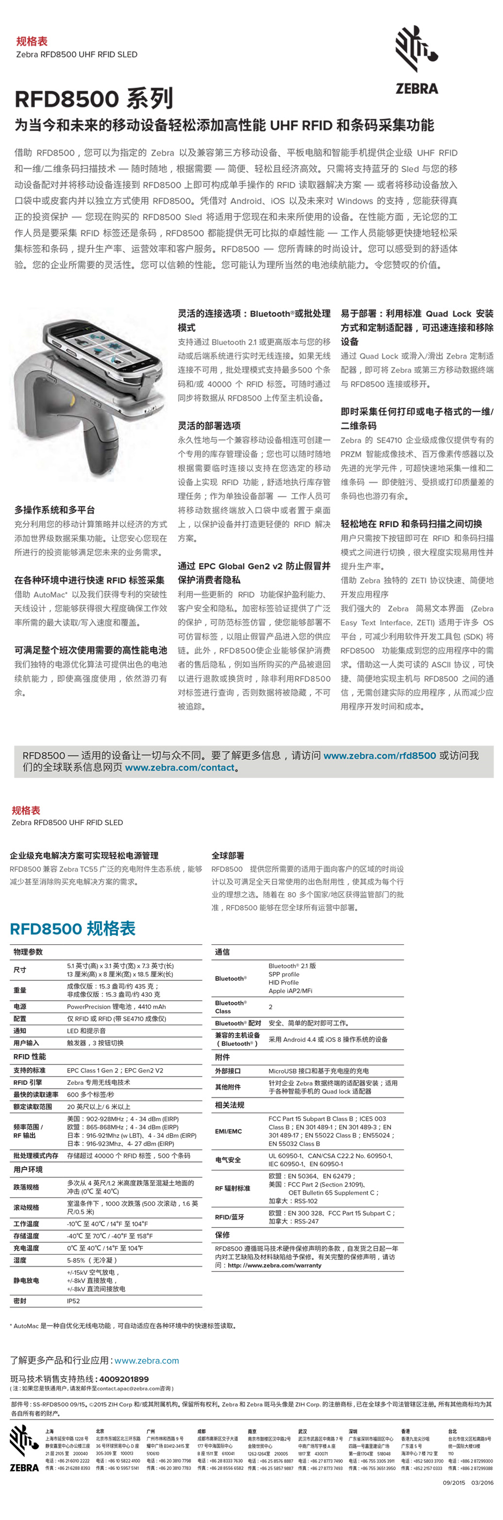 只需将支持蓝牙的Sled与您的移动设备配对并将移动设备连接到RFD8500上即可构成单手操作的RFID读取器解决方案一或者将移动设备放入口袋中或皮套内并以独立方式使用RFD8500.凭借对Android,IOS以及未来对Windows的支持,您能获得真正的投资保护-您现在购买的RFD8500Sled将适用于您现在和未来所使用的设备。在性能方面,无论您的工作人员是要采集RFID标签还是条码,RFD8500都能提供无可比拟的卓越性能-工作人员能够更快捷的轻松采集标签和条码,提升生产率,运营效率和客户服务。RFD8500-您所青睐的时尚设计。您可以感受到的舒适体验。您的企业所需要的灵活性。您可以信赖的性能。您可能认为理所当然的电池续航能力。令您赞叹的价值。
