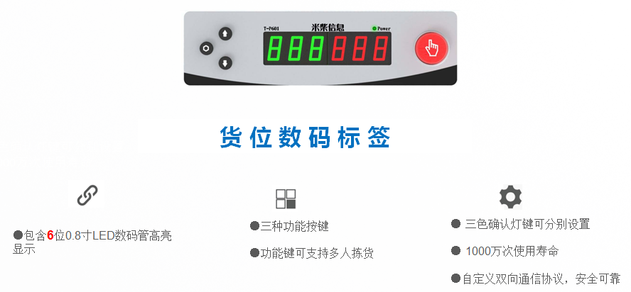 电子拣货标签设备主要用以通过指示灯引导操作人员,同时根据实际现场需要显示不同位数的操作信息。设备同时支持操作人员的按钮动作的检测。