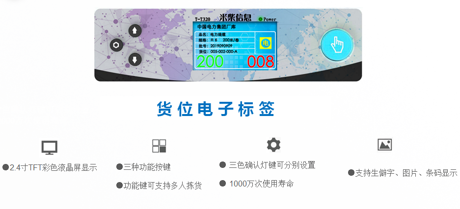 电子拣货标签设备主要用以通过指示灯引导操作人员,同时根据实际现场需要显示不同位数的操作信息。设备同时支持操作人员的按钮动作的检测。