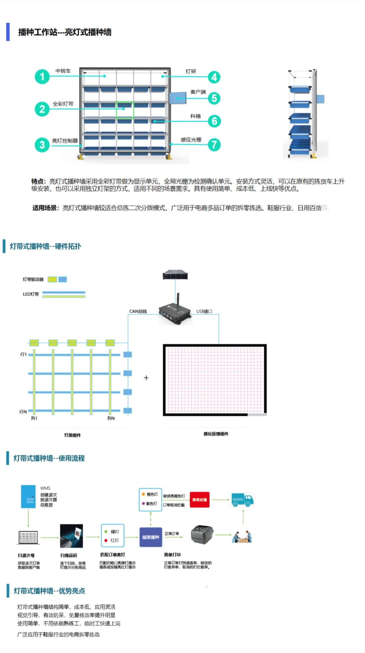 亮灯式播种墙是由亮灯控制器灯带,灯架等组成的可视化分拨设备。设备通过视觉的方式显示栏位,
