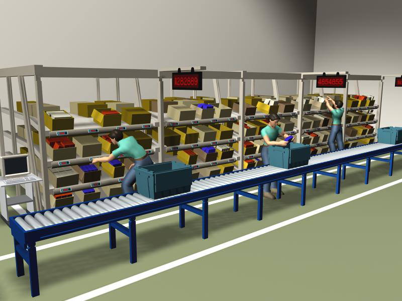 亮灯标签安装与每个库位货架上,扫描要拣货的订单号,该订单需要拣货的库位亮灯,操作人员按灯取货放在小推车上,推入打包台。打包台进行逐个复核,复核一个,灭灯一个。复核完毕后,灯全灭。