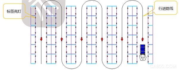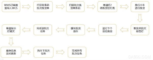 根据订单数据,下发任务后,通过标签显示亮灯功能,待作业工位亮灯提示且屏幕显示拣货数量,员工根据行进路线推行拣选车进行任务操作,每当完成货位任务需拍灭对应指示灯,数据进行上传,直至所有任务完成;