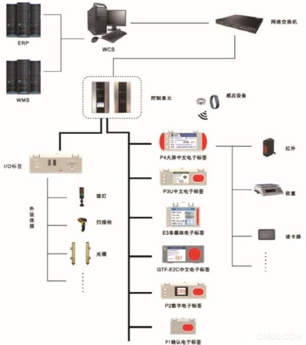 同时可以接入外围设备,如穿戴手环、红外感应、RFID读卡器、电子秤、光栅、光幕等设备,以辅助各种不同的流程需求。等于电子标签赋予了货位主动提示,信息反馈和现场操作的能力。