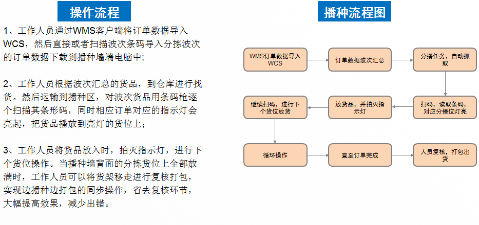 智能播种墙,主要应用在电商行业,也适用于医药、服装、五金仓库等各个领域。通过显示标签系统与RFID及其他检测设备的有效结合,使之达到快速绑定订单,快速指引货物投放位置,快速检测投放的正确性,快速复合货物的件数及准确度。大幅提升客户的工作绩效,使商品的出库出错率几乎为零,大幅降低员工的劳动强度,自动绑定,减少手动扫描绑框动作,提升30%-50%的工作效率。